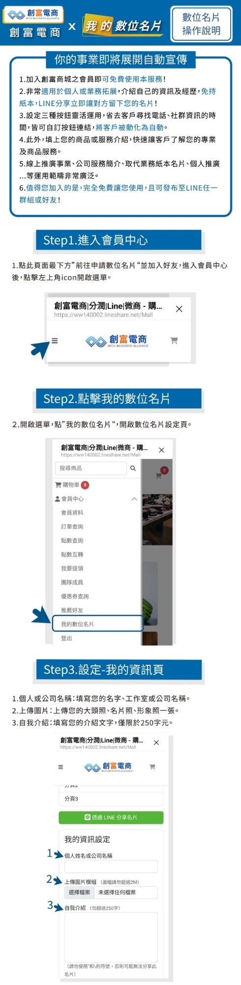 如何讓客戶快速記住你?試試數位名片!Try it!數位化,智能.迅速.高效行銷名片設計.1.即時更新投遞:可隨時更改名片信息2.智能營銷獲客:連接產品服務與商城3.多樣化形式應用:文字.圖片呈現更直觀